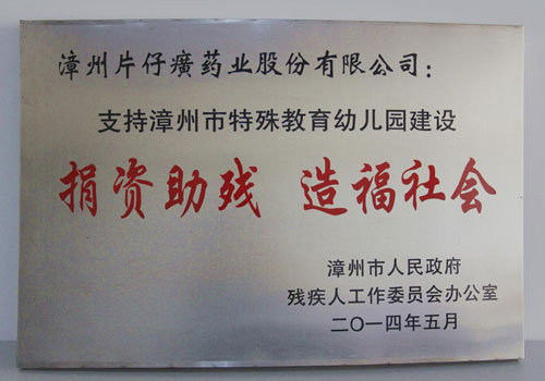 “捐资助残 造福社会”支持漳州市特殊教育幼儿园建设牌匾
